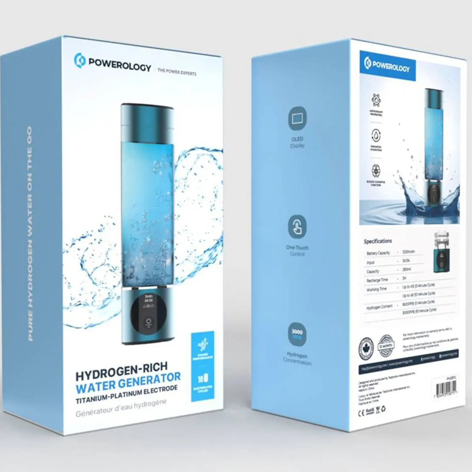 The Powerology Hydrogen Water Bottle with OLED Display is a modern hydration solution designed for a healthier lifestyle. This 280mL bottle uses advanced tech to make hydrogen water. It ensures you get a high-quality product. It has two modes: a 5-minute cycle and a 10-minute cycle. The 5-minute cycle generates up to 1600PPB of hydrogen. The 10-minute cycle produces up to 3000PPB. You can choose the mode based on your needs. Powered by a 1200mAh battery, it supports up to 15 cycles on a single charge, with a recharge time of just 3 hours. The one-touch control and OLED display make it easy to use. They show the water’s hydrogen content and the battery life. Compact and convenient, this innovative bottle is perfect for anyone looking to incorporate the benefits of hydrogen water into their daily routine.